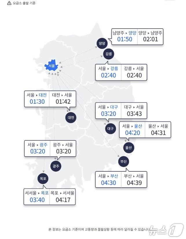 오전 11시 요금소 출발 기준 서울에서 지방 주요 도시까지 예상 소요 시간은 △부산 4시간 30분 △울산 4시간 20분 △강릉 2시간 40분 △양양 1시간 50분(남양주 출발) △대전 1시간 30분 △광주 3시간 20분 △목포 3시간 40분(서서울 출발) △대구 3시간 20분이다.