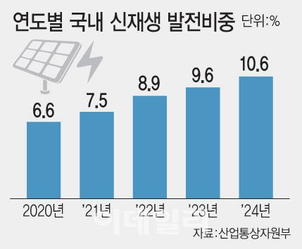 산업통상자원부가 10일 공개한 2024년 에너지수급 동향에 따르면 지난해 신재생 발전량은 전년대비 11.7% 늘어난 63.2테라와트시(TWh)로 집계됐다. 전체 발전량에서 차지하는 비중도 지난해 9.6%에서 10.6%로 1.0%포인트 늘었다.