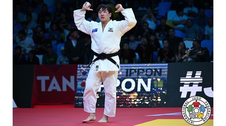 이준환은 어제 카자흐스탄 아스타나에서 열린 국제유도연맹(IJF) 카자흐스탄 바리시 그랜드슬램 2025에서 나가세를 연장전(골든스코어) 접전 끝에 말아업어치기 한판승으로 누르고 금메달을 목에 걸었습니다.