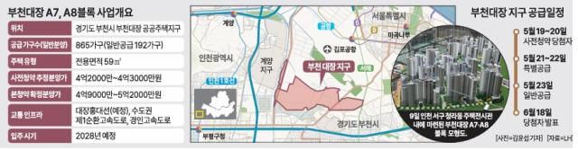 부천대장 A7·A8블록은 이달 19~20일 사전청약 당첨자를 대상으로 본청약을 개시한다. 이어 21~22일 특별공급, 23일 일반 청약자 대상 청약이 예정됐다. 6월 당첨자 발표, 9월 계약체결 예정이며, 입주는 2028년 1월이다.