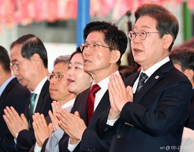 5일 서울 종로구 조계사에서 열린 부처님오신날 봉축법요식 육법공양에서 대선 후보들이 헌화 후 합장 있다. 앞줄 오른쪽부터 이재명 더불어민주당 대선 후보, 김문수 국민의힘 대선 후보, 김재연 진보당 상임 대표, 권영국 정의당 대선 후보, 한덕수 대선 예비후보. (대통령실통신사진기자단) 2025.05.05. /사진=최진석 |