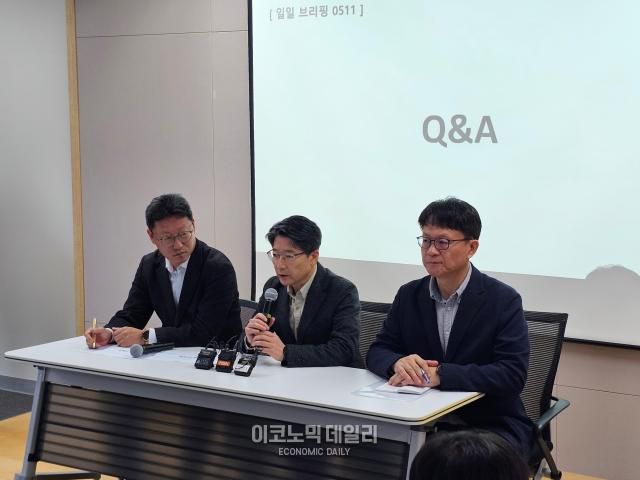 SK텔레콤이 11일 서울시 중구에 위치한 삼화빌딩에서 해킹 사고 이후 수습 상황에 대해 설명하는 브리핑을 열었다. (왼쪽부터)김희섭 PR센터장, 임봉호 MNO사업부장, 류정환 네트워크인프라센터장.[사진=선재관 기자]