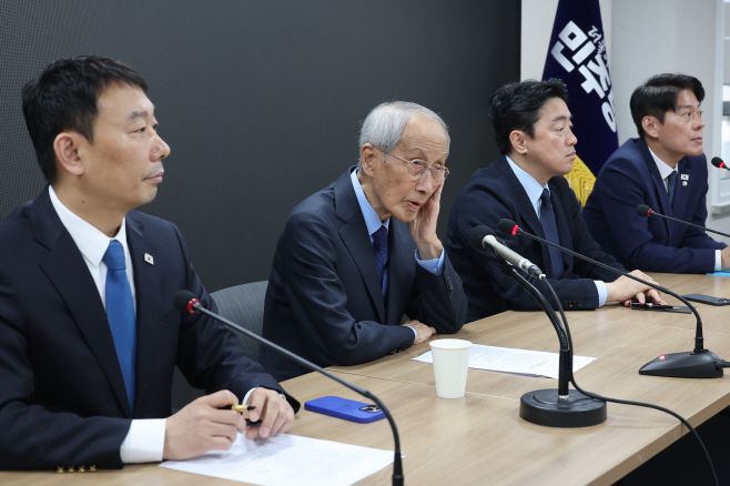 윤여준 더불어민주당 상임총괄선대위원장이 11일 서울 여의도 당사에서 기자간담회를 하고 있다. /연합 |