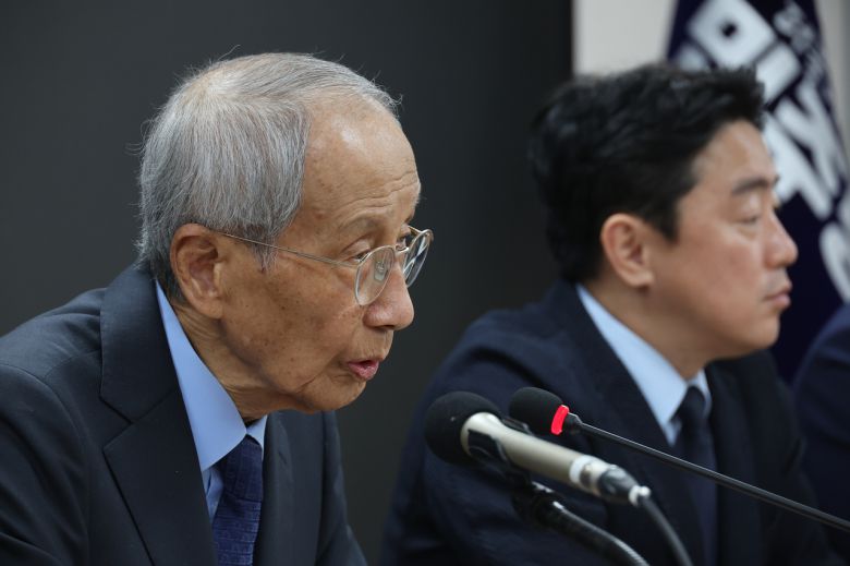 더불어민주당 윤여준 상임총괄선대위원장이 11일 서울 여의도 당사에서 기자간담회를 하고 있다. <연합> |