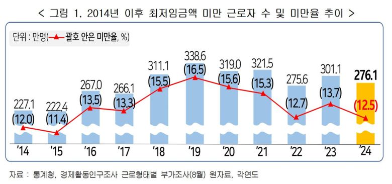 한국경영자총협회(회장 손경식)가 11일 통계청 원자료를 분석해 발표한 ‘2024년 최저임금 미만율 분석’에 따르면 작년 법정 최저임금액(시급 9860원)을 받지 못한 근로자는 276만1000명으로 집계됐다. 이는 전년 대비 25만명 감소한 수치다.