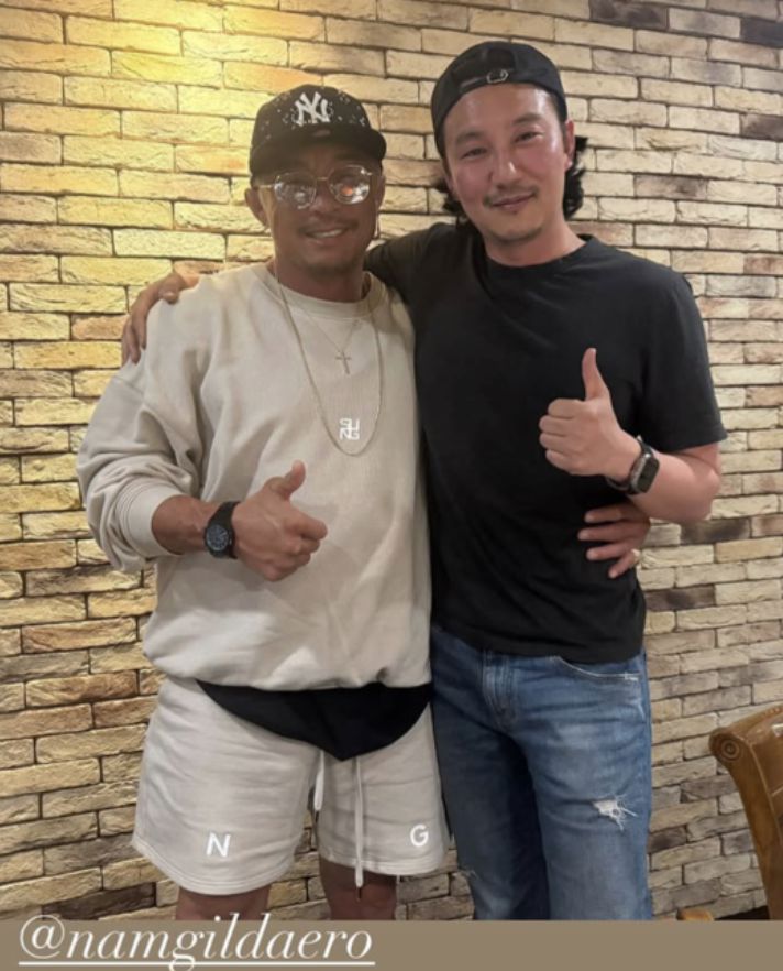 공개된 사진에는 추성훈과 김남길이 어깨동무를 하고 엄지를 치켜든 ‘엄지척’ 포즈를 취하고 있는 모습이다. 특히 추성훈은 김남길의 허리에 손을 두르며 친분을 표하며 훈훈함을 더했다.