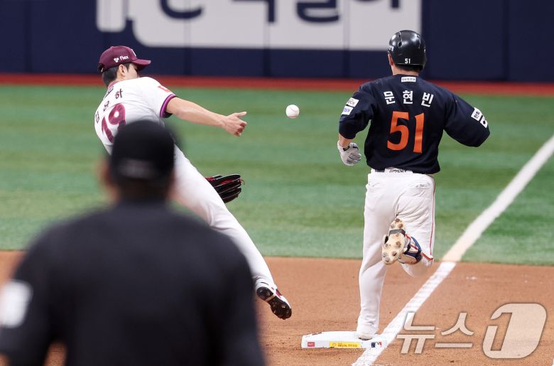 (서울=뉴스1) 김성진 기자 = 키움 선발 김윤하가 11일 서울 구로구 고척스카이돔에서 열린 '2025 신한 SOL뱅크 KBO리그' 한화 이글스와 키움 히어로즈의 경기에서 1회초 2사 한화 문현빈의 1루수 앞 땅볼 때 포구 실책을 하고 있다. 2025.5.11/뉴스1
