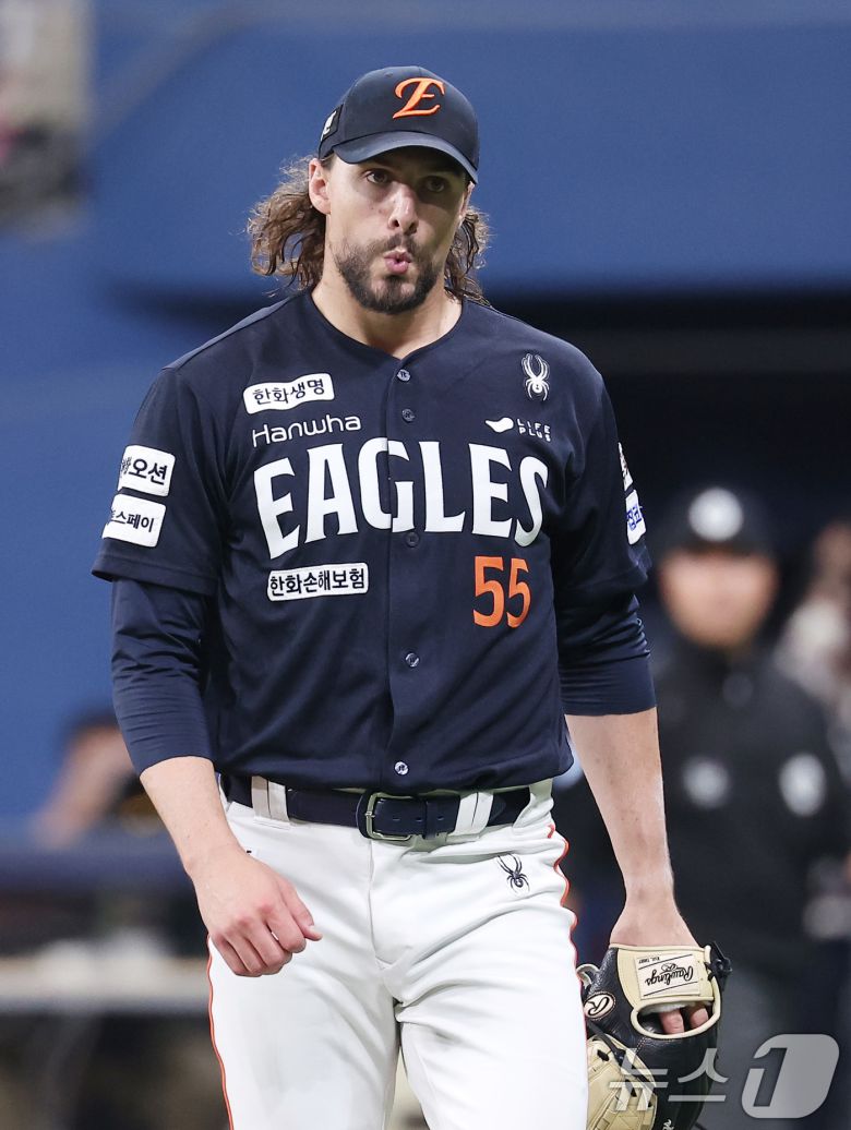 (서울=뉴스1) 김성진 기자 = 11일 서울 구로구 고척스카이돔에서 열린 '2025 신한 SOL뱅크 KBO리그' 한화 이글스와 키움 히어로즈의 경기, 한화 선발 와이스가 3회말 2사 키움 송성문을 중견수 플라이로 아웃시킨 후 안도하고 있다. 2025.5.11/뉴스1