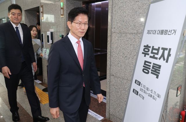 ▲국민의힘 김문수 대선 후보가 11일 경기도 과천 중앙선거관리위원회에서 제21대 대통령선거 후보 등록 후 밖으로 나서고 있다. ⓒ연합뉴스