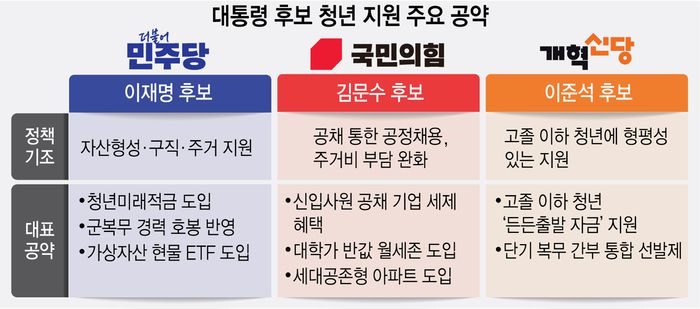 # 6·3 조기대선 대진표가 완성된 가운데 각 후보별로 청년층의 표심을 공략하기 위한 일자리·부동산 대책이 주목받고 있다. 후보들은 취업에 어려움을 겪는 청년층을 지원하기 위해 구직급여를 지급하거나 공채를 확대하는 방안을 내놨다. 자산 형성 지원을 위한 적금 제도 도입, 주거비 부담 완화를 위한 공공 기숙사 및 반값 월세 등의 대책도 포함됐다.