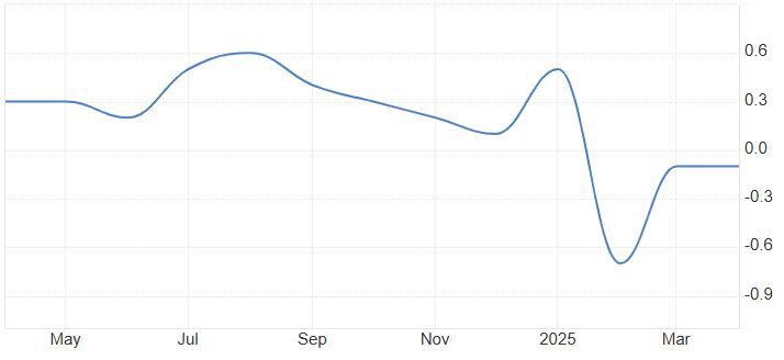 중국 소비자물가지수(CPI) 상승률. 단위 %. 전년 동월 대비 기준. 4월 마이너스(-) 0.1%. 출처 트레이딩이코노믹스 |