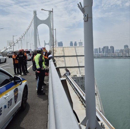 11일 형제복지원 피해생존자인 최승우씨가 부산 광안대교 상판에 올라가 고공 농성을 하고 있다. 부산경찰청 제공