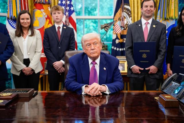 도널드 트럼프(가운데) 미국 대통령이 9일 워싱턴 백악관 집무실에서 행정명령에 서명한 뒤 기자들의 질문에 답변하고 있다. 워싱턴=UPI 연합뉴스