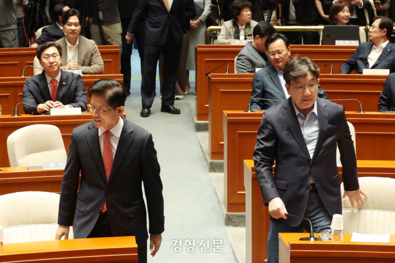 김문수 국민의힘 대선 후보(앞줄 왼쪽)와 권성동 원내대표(앞줄 오른쪽)가 11일 국회에서 열린 의원총회에 참석하고 있다. 한수빈 기자
