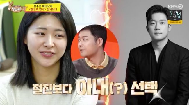 박명수는 "와이프겠죠 당연히"라고 말했고, 김숙은 "절친이냐 와이프냐"고 재차 물었다. 이에 전현무는 "절친 보단 와이프죠"라며 "그리고 그런걸 떠나서 당연히 KBS 를 응원해야죠"라고 망설임 없이 홍주연을 택해 눈길을 끌었다. 이를 들은 엄지인은 "그럼 만약에 제가 나갔다. 저랑 김대호다"라고 물었고, 전현무는 "김대호요"라고 즉답해 폭소를 자아냈다.