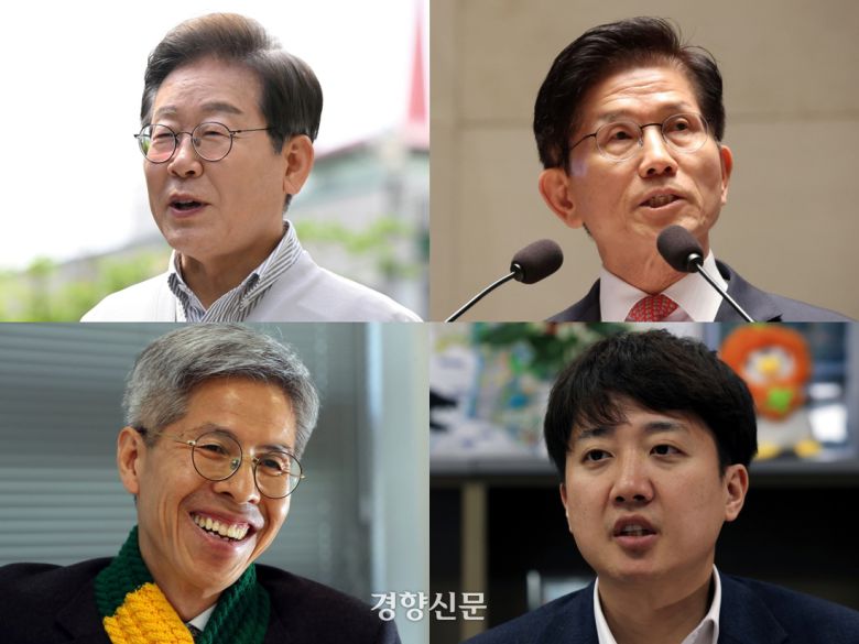 제21대 대통령 선거에 출마한 (왼쪽 위부터 시계 방향으로)이재명 더불어민주당 후보, 김문수 국민의힘 후보, 이준석 개혁신당 후보, 권영국 민주노동당 후보. 박민규·한수빈·서성일 기자