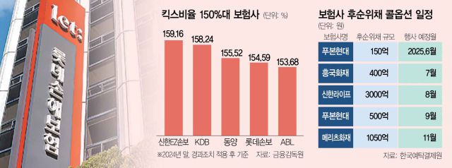 이들 업체는 킥스 비율이 상대적으로 낮다. 지난해 말 경과 조치 시행 이후 기준으로 150%대인 보험사는 △롯데손보 154.59% △푸본현대 157.3% △KDB생명 158.24% △현대해상 157% 등이다.