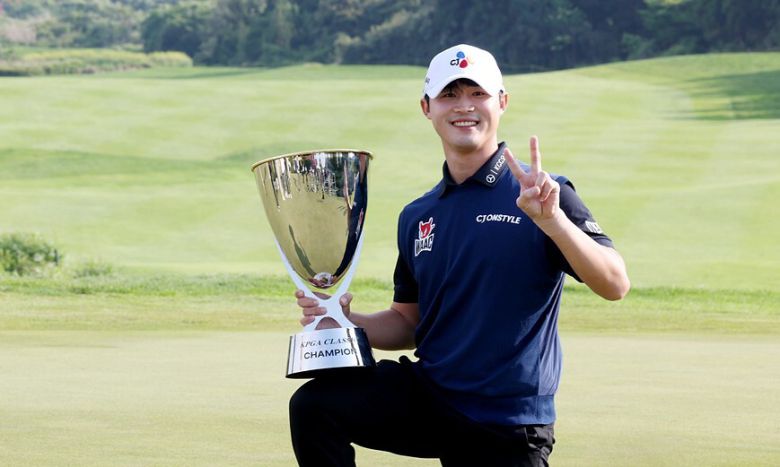 배용준이 11일 제주 서귀포의 사이프러스 골프&리조트 북서코스(파71·7120야드)에서 열린 한국프로골프(KPGA) 투어 KPGA 클래식에서 우승한 뒤 트로피를 들고 포즈를 취하고 있다. KPGA 제공 |