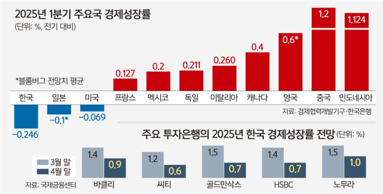한국 경제를 지켜보던 국내외 기관들도 1분기 역성장 소식에 빠르게 눈높이를 낮추고 있다. 국제금융센터에 따르면 해외 주요 투자은행(IB) 8곳이 제시한 올해 우리나라 경제성장률 전망치는 지난 3월 말 평균 1.4%에서 지난달 말 평균 0.8%로 거의 반토막이 났다.