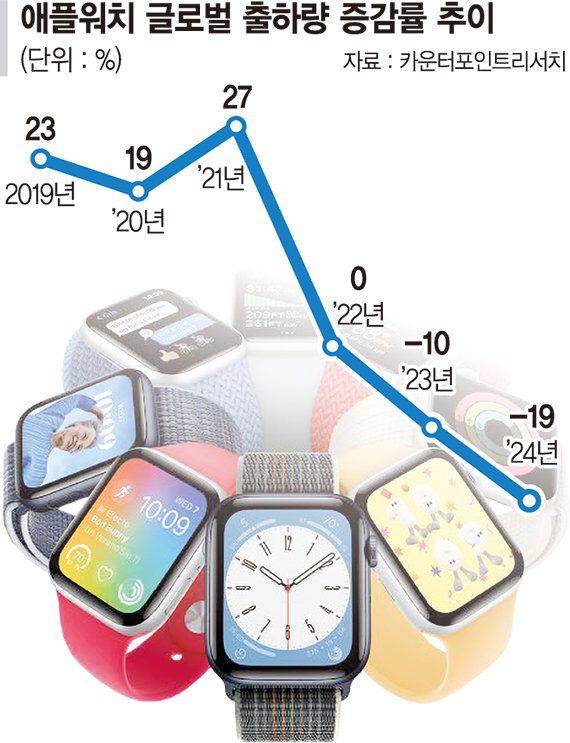11일 시장조사기관 카운터포인트리서치에 따르면 지난해 애플워치 출하량은 전년 대비 19% 감소했다. 인도를 제외한 모든 지역에서 출하량이 줄었다. 애플워치 전체 출하량의 절반 이상을 책임지는 북미 시장 판매 부진이 가장 큰 영향을 미쳤다. 애플워치는 2022년 0%에 이어 2023년(-10%) 역성장을 나타내며 2년 연속 두 자릿수 감소세를 보였다. 애플워치 출하량 증가율은 2021년(27%)을 정점으로 3년째 하락세를 그리고 있다. 분기 기준으로도 최근 5분기 연속 전년 대비 출하량이 줄었다. 글로벌 인플레이션 가속화로 인한 구매력 저하 등에 고가의 애플워치를 구매하려는 시장 수요가 크게 하락한 것으로 분석됐다.