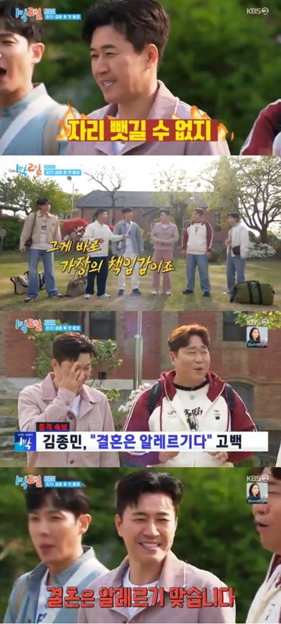 11일 방송된 KBS 2TV '1박 2일 시즌4'에서는 김종민이 결혼을 알레르기에 비유하는 모습이 전파를 탔다.