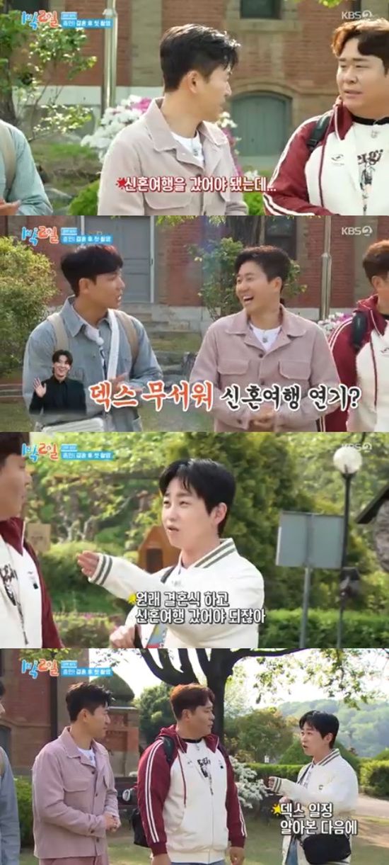 딘딘은 김종민이 결혼식 후 바로 신혼여행을 갔다면 덱스가 대신 올 수 있었는데 김종민이 덱스 일정을 알아보고 신혼여행 일정일 미룬 것 같다고 몰아갔다.