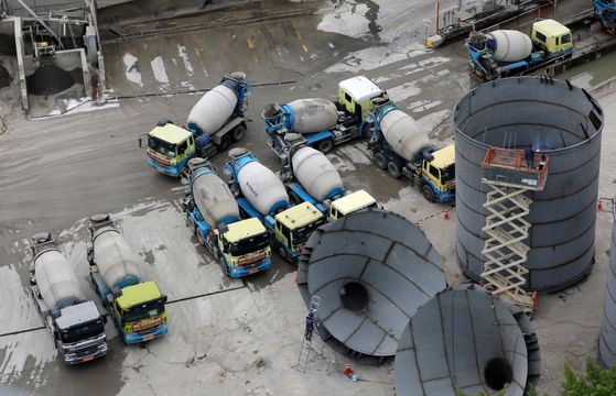 경기도에 위치한 한 레미콘 공장에 믹서트럭이 시멘트 등을 혼합한 콘크리트를 실어 나르고 있다.[뉴스1]