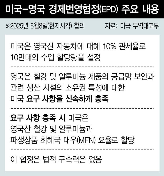미-영 품목별 관세 인하는 미확정된 것이 많은 것으로 확인된다. 미 무역대표부(USTR)가 8일 공개한 ‘미-영 경제번영협정(EPD) 합의문’을 보면, 철강 관세 인하 폭과 시기가 적혀 있지 않다. 영국산 철강은 25% 관세가 철폐됐다는 일부 언론 보도의 내용과 다른 것이다. 합의문에는 ‘영국은 철강 및 알루미늄의 공급망 보안과 생산 시설의 소유권 특성에 대한 미국 요구를 충족해야 한다. 충족 시 최혜국 대우 요율로 할당량을 구성”이라고 전제 조건만 명시돼 있다.