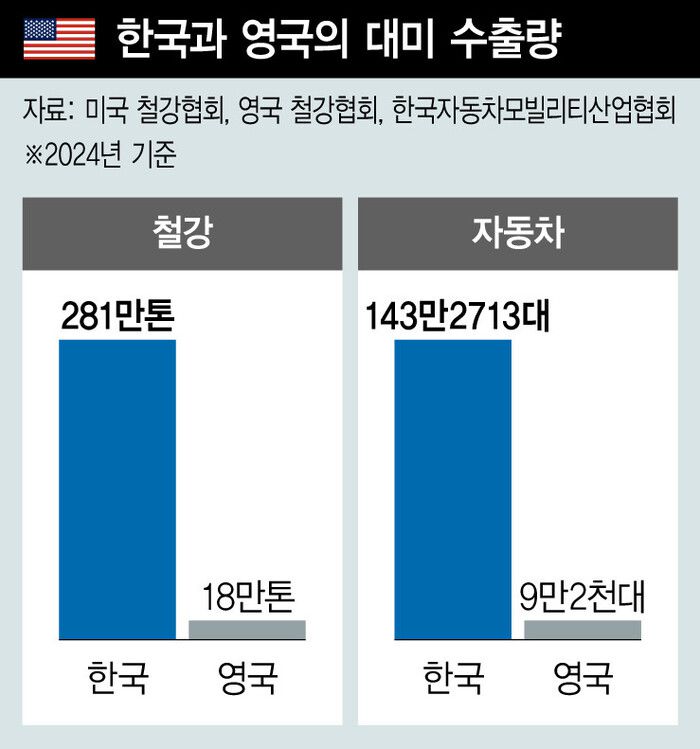 영국 사례를 볼 때 한국의 품목별 관세 인하는 더욱 어려운 과정을 거칠 공산이 높다. 한국은 영국에 견줘 대미 철강 수출은 약 16배(지난해 기준·한국 281만톤, 영국 18만톤), 자동차 수출도 약 16배(한국 143만대, 영국 9만대)다. 미흡하지만 관세율 인하 가능성이 높은 영국과는 처지가 다르다는 뜻이다. 장상식 한국무역협회 국제무역통상연구원장은 “한국은 영국보다 대미 수출량이 많은 탓에 품목별 관세를 협상 의제로 올려놓기 쉽지 않을 것”이라며 “협상 의제가 된다고 해도 미국이 여러 조건을 붙일 가능성이 있다. 한국에도 중국 견제 동참 등을 요구할 것”이라고 말했다.