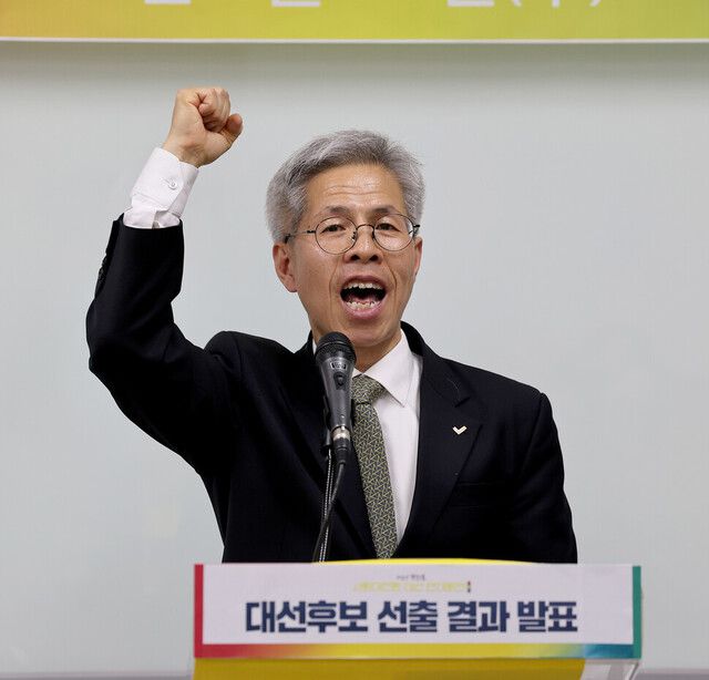 원외 진보정당인 민주노동당(옛 정의당) 권영국 대통령 후보가 11일 “모두가 우클릭하는 이 시대에 광장의 외침을 잊지 않고, 민중과 함께하겠다”며 대선 완주 의사를 거듭 밝혔다. 반면, 민주노동당과 같은 뿌리였던 원내 진보당은 지난 9일 김재연 상임대표의 후보 사퇴와 이재명 더불어민주당 후보 지지 선언을 두고 내홍이 이어지고 있다.