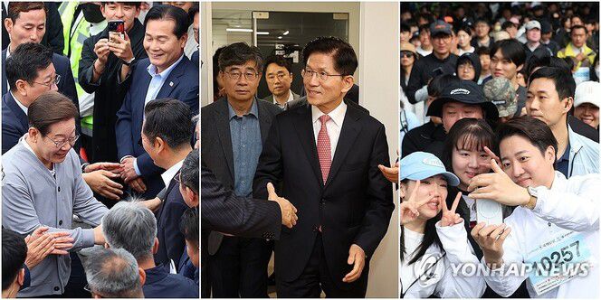 제21대 대통령 선거 공식 선거운동 시작을 하루 앞둔 11일 남도문화벨트 골목골목 경청투어에 나선 이재명 더불어민주당 대통령 후보(왼쪽부터), 국민의힘 당사로 들어서는 김문수 국민의힘 후보, 다이아몬드브릿지 걷기 축제에 참가해 시민들과 기념사진을 찍는 이준석 개혁신당 후보의 모습. 연합뉴스