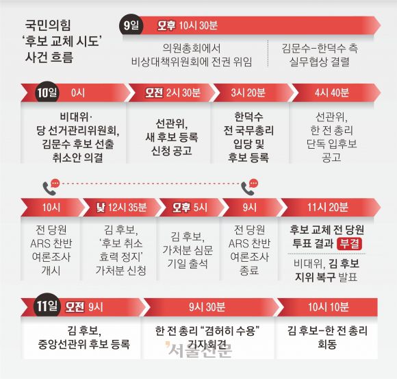 9일 단일화 협상이 두 차례 결렬되자 지도부는 10일 0시쯤 후보 교체 작업에 본격 착수했다. 우선 비대위와 당 선거관리위원회(선관위)를 열어 ‘김 후보 선출 취소안’을 의결했다. 이후 오전 2시 30분 이양수 국민의힘 선관위원장은 김 후보의 선출 취소를 알리는 공고와 대통령 후보자 등록 신청 공고를 냈다. 새 후보 등록 신청 기간은 오전 3시부터 4시까지 한 시간뿐이었다.