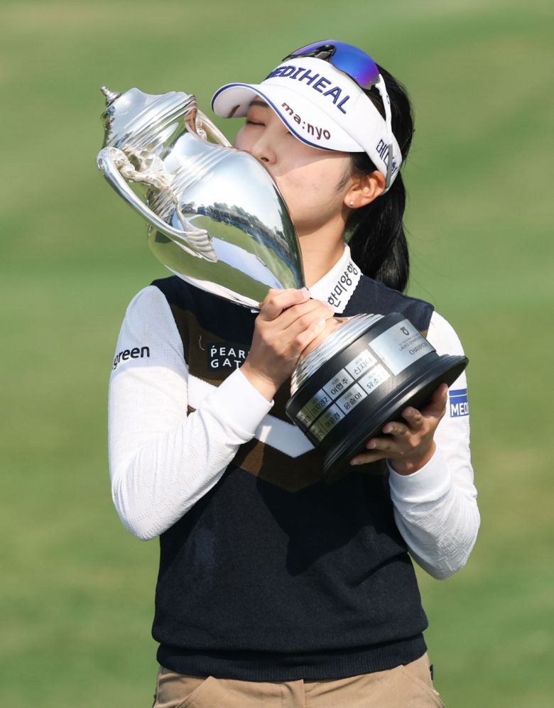 이예원이 11일 열린 KLPGA 투어 NH투자증권 레이디스 챔피언십에서 우승한 뒤 트로피에 입 맞추고 있다. KLPGA 제공 |