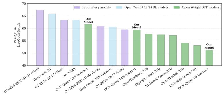 코드 중심 벤치마크인 라이브코드벤치(LiveCodeBench)에서 오픈AI의 'o3-미니'와 'o1-로우(low)'를 능가하는 성능을 보였다. 특히, 32B 모델은 오픈 소스 모델 중 코드 추론 성능에서 최상위권을 기록했다.
