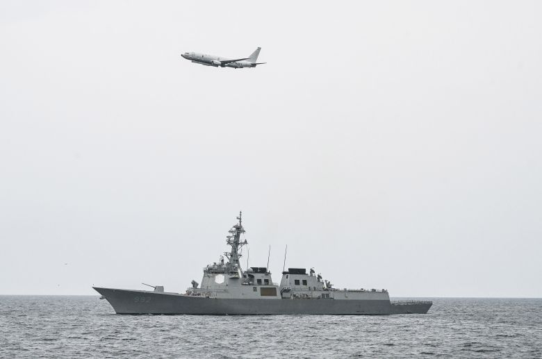 율곡이이함(DDG)과 미 해군 P-8 해상초계기가 5월 9일 한미 연합 해상대특수전부대작전(MCSOF) 훈련을 하고 있다. /해군 |
