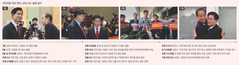 당 지도부는 결국 지난 9일 후보 교체 시나리오를 실행에 옮기기로 했다. 김 후보가 같은 날 의원총회에서 당 지도부를 비판한 뒤 20분 만에 퇴장하면서 미온적이던 의원들의 지지도 얻어냈다. 법원이 김 후보가 제기한 ‘대선 후보 지위 인정 가처분 신청’과 ‘당 전국위원회·전당대회 개최 금지 가처분 신청’을 모두 기각하자 마지막 걸림돌도 사라진 것처럼 보였다.
