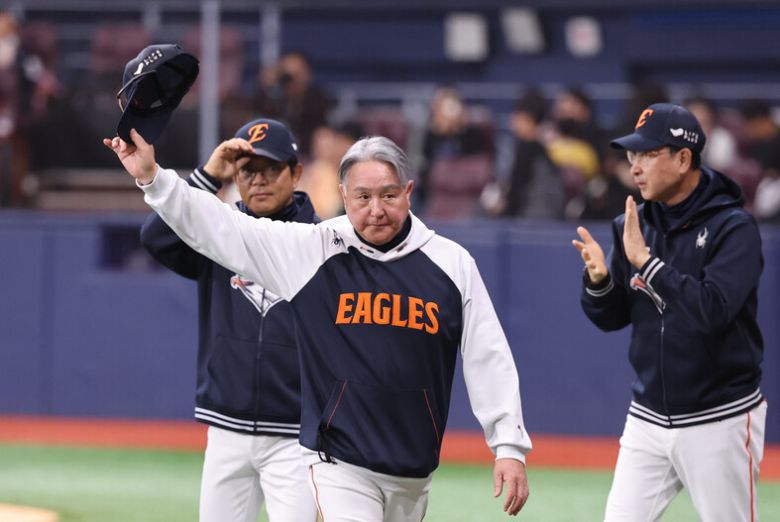 한화 이글스 김경문 감독이 11일 서울 고척스카이돔에서 열린 2025 KBO리그 키움 히어로즈와 경기에서 승리한 뒤 관중을 향해 인사하고 있다. 연합뉴스 |