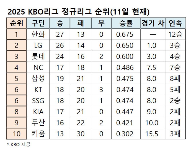 한화는 11일 서울 고척스카이돔에서 열린 2025 KBO리그 키움 히어로즈와 방문 경기에서 8-0, 완승을 하면서 12연승을 달성했다. 지난 4월26일 케이티(kt) 위즈와 경기부터 지는 법을 잊었다. 한화의 12연승은 1992년 5월 이후 처음이다.