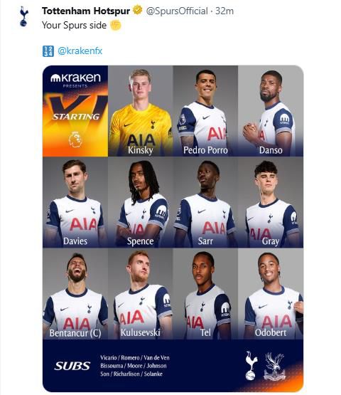 토트넘의 크리스털 팰리스전 출전 선수 명단.[토트넘 구단 SNS. 재판매 및 DB 금지]
