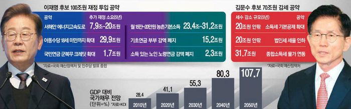 ‘100조 재정 투입’ 이재명 ‘70조 감세’ 김문수…나라 곳간은 어디서?