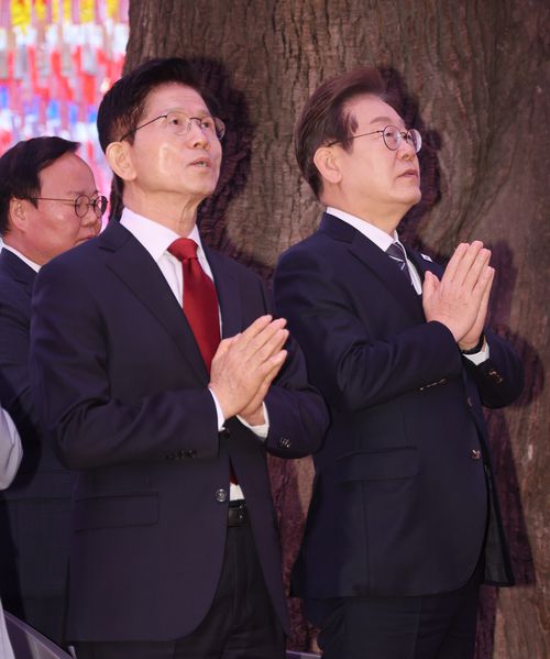 이재명 더불어민주당 대선 후보와 김문수 국민의힘 대선 후보가 지난 5일 서울 종로구 조계사에서 열린 부처님오신날 봉축법요식에서 합장하고 있다. [사진 = 대통령실사진기자단]