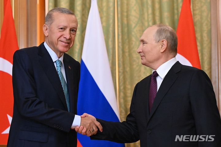 [소치=AP/뉴시스] 블라디미르 푸틴(오른쪽) 러시아 대통령과 레제프 타이이프 에르도안 튀르키예 대통령. (사진=뉴시스DB)