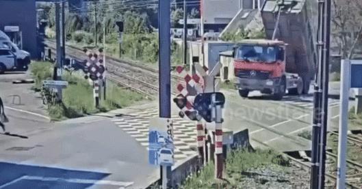 영상에는 덤프트럭이 적재함을 올린 채 기차 선로를 가로질러 가던 중, 적재함에 송전선이 걸려 폭발과 함께 고꾸라지는 모습이 담겨 있다.