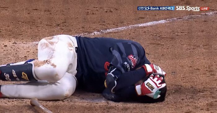 공을 던진 오원석의 표정은 흙빛이 됐다. 그는 황급히 마운드를 내려와 이호준의 상태를 살폈다.