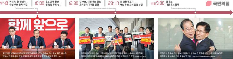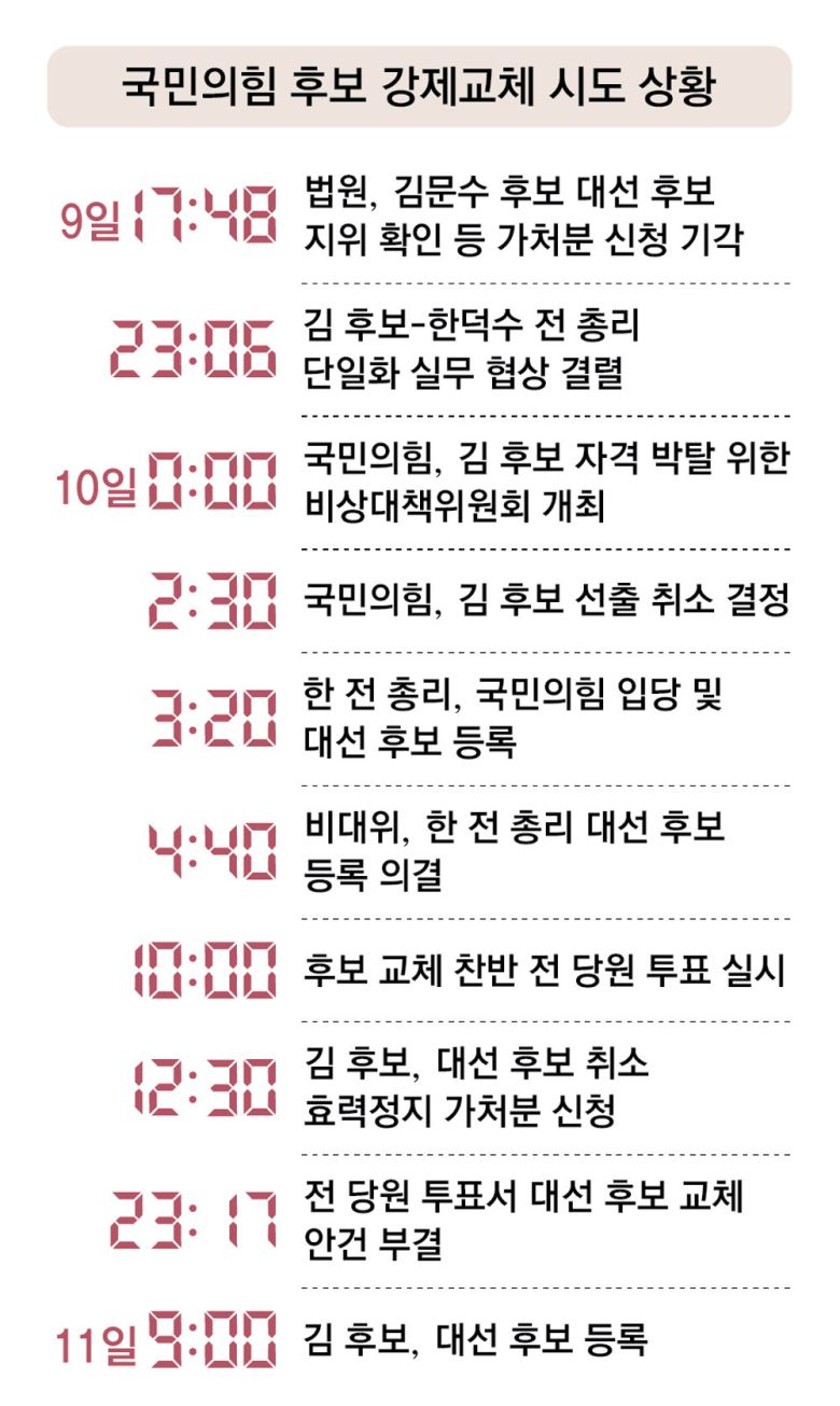 11일 국민의힘에 따르면 김 후보를 한 전 총리로 교체하는 데 앞장선 것은 주류인 ‘반탄파’(탄핵 반대파)인 친윤 의원들이었다. 당에 기반이 없는 한 전 총리를 내세워 ‘찬탄파’(탄핵 찬성파)를 배척하고 주류 입지를 유지하려는 전략으로 풀이됐다. 이들은 한 전 총리와의 단일화를 약속한 김 후보에게 당심을 몰아주어 경선에서 한동훈 전 대표와 홍준표 전 대구시장 등을 꺾었고, 이후 김 후보가 후보 등록일(11일) 전 단일화 약속을 지키지 않자 끝내 강제 단일화를 밀어붙였다.