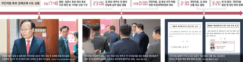 당내에선 권영세 전 비상대책위원장과 권성동 원내대표 등 한 전 총리 추대를 밀어붙인 친윤계 인사들에 대해 당직 사퇴에 더해 징계, 정계 은퇴 요구까지 빗발쳤다. 홍 전 시장은 페이스북에 “대선 경선판을 혼미하게 한 책임을 지고 권 전 비대위원장과 권 원내대표, 박수영 성일종 의원은 의원직 사퇴하고 정계 은퇴하라”고 했다. 박수영 성일종 의원은 경선 시작 전부터 한 전 총리 추대론을 띄웠다. 김 후보 측근 그룹에선 권 전 비대위원장 등에 대해 당원권 정지 3년 징계를 내려야 한다는 주장도 나왔다.