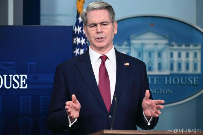 스콧 베선트 미국 재무부 장관이 지난 4월29일(현지시간) 워싱턴DC 백악관에서 열린 도널드 트럼프 대통령 취임 100일간 경제 분야 성과 브리핑에서 관련 질문에 답하고 있다. /AFP=뉴스1