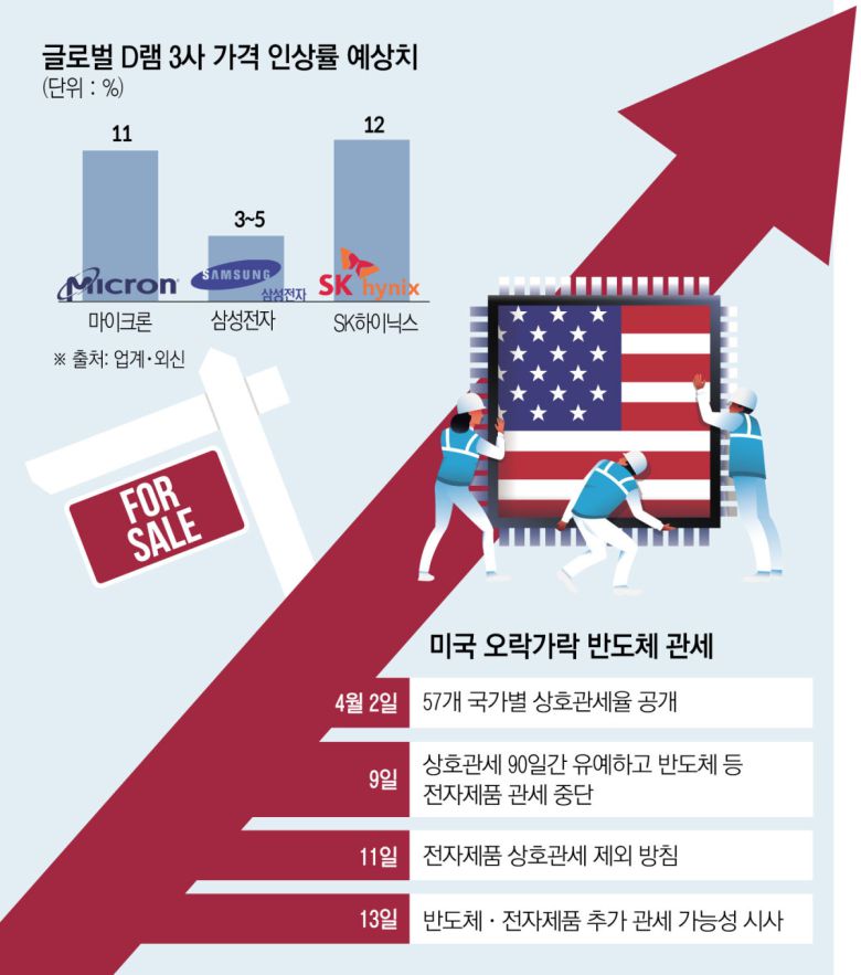 11일 업계와 외신에 따르면 SK하이닉스는 최근 D램 제품 가격을 12% 인상했다. 앞서 마이크론은 지난달 고객사에 ‘트럼프 관세에 따른 추가 요금 부과’ 방침의 서한을 보냈다. 마이크론은 미국에 본사를 두고 중국과 대만, 일본, 말레이시아, 싱가포르 등 주로 아시아에 공장을 운영 중이다. 이 지역에서 생산한 제품은 미국으로 들어온다. 가격 인상률은 11%로 알려졌다. 삼성전자도 D램과 낸드플래시 가격을 3~5% 인상할 예정으로 글로벌 고객사들과 협의 중이라는 소문이 확산했다.