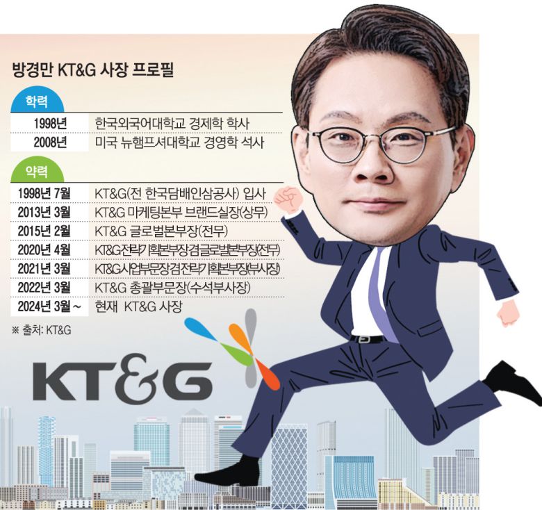 11일 KT&G에 따르면 방 사장은 ’정통파 KT&G맨’이다. 한국외국어대학교 경제학과 졸업 후 1998년 KT&G 전신인 한국담배인삼공사에 입사, 27년 넘게 KT&G에 몸담았다. 2008년 미국 뉴햄프셔대학교(University of New Hampshire)에서 경영학 석사(MBA) 과정을 마친 그는 KT&G에서 글로벌본부장, 전략기획본부장, 사업부문장, 총괄부문장 등을 역임했다. 높은 사업 이해도와 전문성을 갖춘 그는 작년 3월 KT&G 대표이사 사장에 올랐다.
