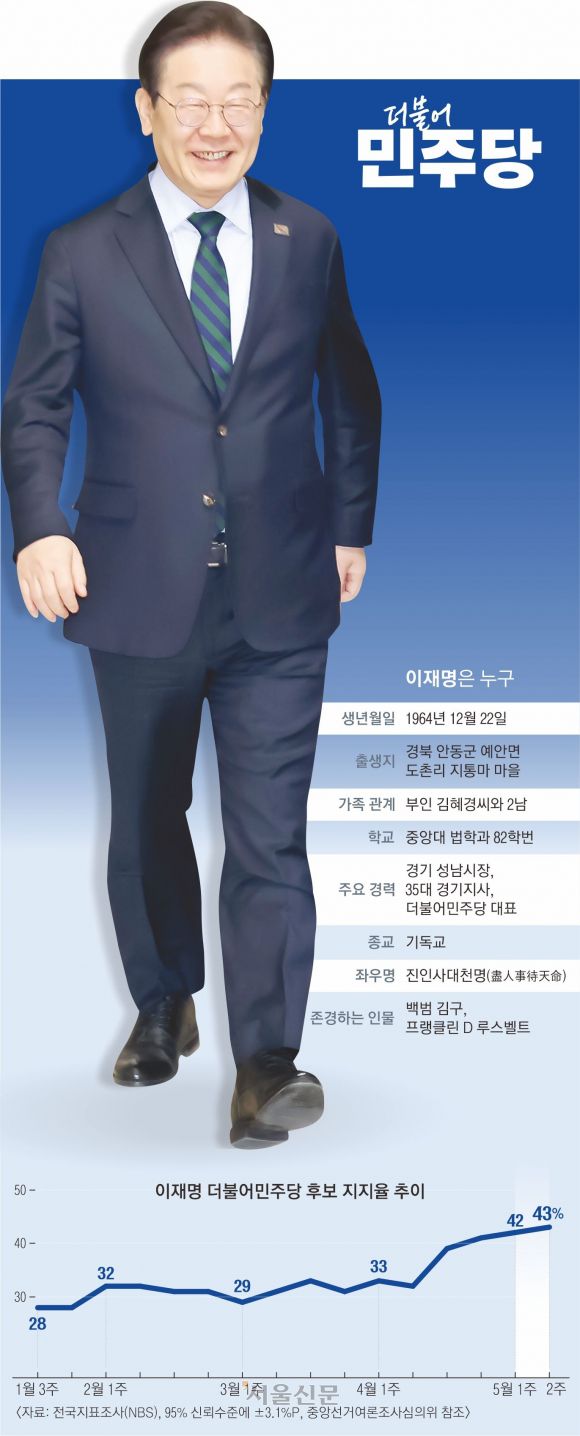 ‘기호 1번’을 달고 6·3 대선에 도전하는 이재명 더불어민주당 후보는 진보당 후보로 나선 김재연 상임대표와의 단일화로 진보 진영 ‘단일대오’를 완성하는 동시에 거침없는 ‘우클릭’으로 중도 확장에 나설 계획이다. 지난 20대 대선 때 0.73% 포인트 차이로 석패했던 결과를 반복하지 않기 위해 돌다리도 두들겨 보는 심정으로 진보 진영 ‘원팀’을 만든 것이다. 향후 이 후보는 신변 안전 등 돌발 변수가 어디서 튀어나올지 모르는 만큼 최대한 ‘신중 모드’로 선거전을 치를 것으로 보인다.